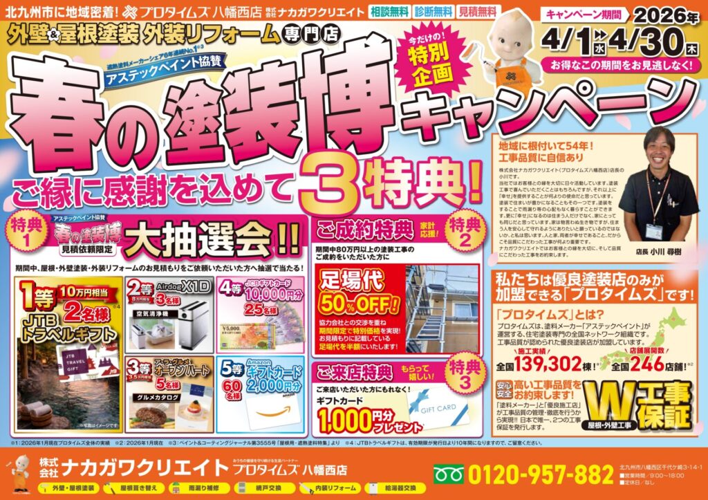 北九州市八幡西区・若松区を中心に屋根塗装・外壁塗装、水回り等その他リフォーム工事を行っているプロタイムズ八幡西店 株式会社ナカガワクリエイト 外装劣化診断士の小川です。